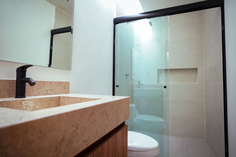 • Baño compartido para recamaras secundarias. Todos los baños están equipados con canceles de cristal templado, mueble con lavabo de mármol y espejo.